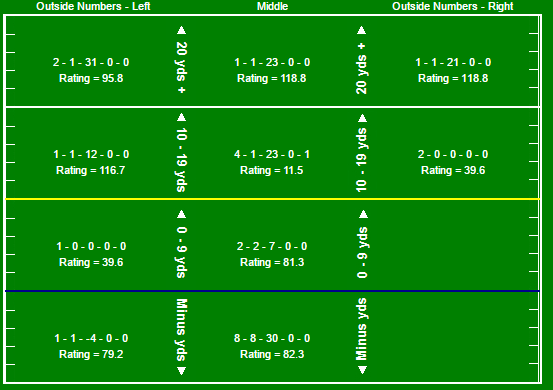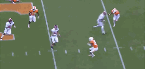 On the year he has rushed for 480 yards on 70 carries, forcing eight missed tackles and scoring eight touchdowns. 105 of those yards, and 20 of those carries have come on quarterback scrambles, but he has been excellent on designed runs as well. Six of his touchdowns have come on designed quarterback runs off right end, and this is where he did the most damage against Tennessee. Rushing for 93 of his 146 yards, and two of his three touchdowns off right end, Tennessee just couldnāt stop him throughout the game.