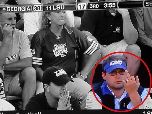 You guys happen to catch the "class act" LSU fan flipping the bird on national TV during the Georgia game on Saturday. Yeah your team is losing, but show some class and respect -- families do watch the game...I had to shoo my little one out of the room.