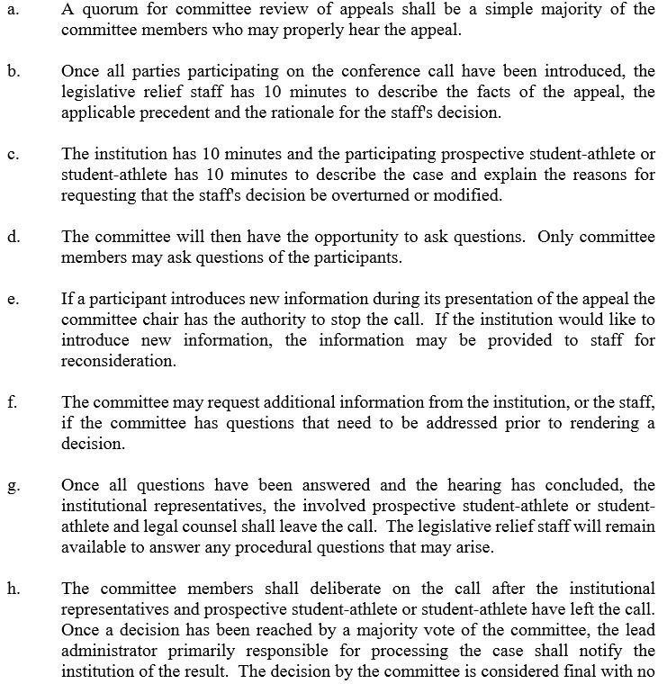 .@CecilHurt had a nugget in today's article regarding the JQ appeal. Bama is requesting a teleconference appeal, typically done for more complex waiver scenarios. It allows JQ to speak directly to the Legislative Relief committee, but it also allows legal counsel for JQ and/or the institution to be involved, if desired. If the teleconference is granted, the committee is allowed a minimum of 48 hours to review documentation, although this is also flexible. Teleconference procedure is attached, if you're interested in those details.